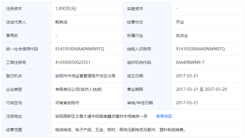 安阳市胜华电缆有限公司这家电线电缆厂家成立于2017年3月21日,是一家成立还不到5年的非常年轻的电缆电缆厂家,安阳市胜华电缆有限公司注册场地位于安阳高新区文昌大道中段路南鑫发建材市场南排一号,是安阳市地区非常著名的高新技企业聚集地,公司注册资金1000万,公司法定代表人韩典洁,同时韩典洁还担任安阳市胜华电缆有限公司的执行董事兼总经理,张留生担任公司监事。